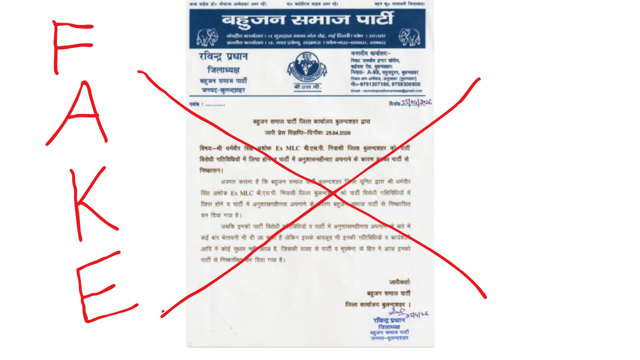 गौरतलब है कि बुलंदशहर बसपा के जिलाध्यक्ष रवींद्र प्रधान के जाली लेटरपैड से मेवालाल गौतम, मुनकाद अली और नौशा अली को पार्टी से निकालने संबंधी विज्ञप्ति जारी हुई थी। इसको लेकर सोशल मीडिया पर हलचल का दौर शुरू हुआ तो मायावती ने पोस्ट कर पूरे मामले का खंडन कर दिया।