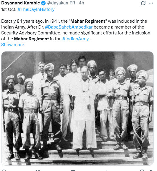 अपनी स्थापना के८४ वर्ष पूरे करने जा रही महार रेजीमेंट की स्थापना में भारत के संविधान निर्माता डॉ. बीआर अंबेडकर की बड़ी भूमिका रही है। रेजीमेंट में उपलब्ध ऐतिहासिक दस्तावेजों के मुताबिक सन 1892 से तत्कालीन अंग्रेज सरकार ने केवल उच्च वर्ग की जातियों को ही सेना में लेने नियम बना दिया था। जिसका विराेध डॉ. अंबेडकर के पिता सूबेदार मेजर रामजी मालोजी सकपाल ने पुरजोर तरीके से किया।