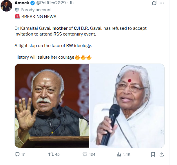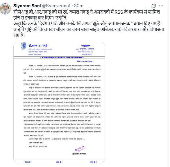 मुख्य न्यायाधीश भूषण गवई की मां कमल गवई ने आरएसएस के शताब्दी कार्यक्रम में शामिल होने से इनकार कर दिया है। 84 वर्षीय कमल गवई ने पत्र लिखकर कहा कि कार्यक्रम की खबर सामने आने के बाद उन पर और उनके दिवंगत पति दादासाहेब गवई पर अंबेडकरवादी विचारधारा छोड़ने जैसे आरोप लगाए गए, जिससे वह आहत हुईं।
