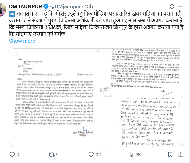 इस सम्बन्ध में मुख्य चिकित्सा अधीक्षक, जिला महिला चिकित्सालय जौनपुर के द्वारा अवगत कराया गया है कि मोहम्मद उस्मान एवं मयंक श्रीवास्तव के द्वारा अनधिकृत रूप से प्रसूता वार्ड में प्रवेश कर भर्ती मरीज को बहला-फुसला कर बयान लिया गया है एवं मरीज को बिना किसी सूचना के अस्पताल परिसर से भगा दिया गया। जिसकी सूचना भण्डारी पुलिस चौकी में दे दी गयी है। सोशल मीडिया से प्राप्त वी०डि०ओ० की जॉच-पड़ताल की गयी तो संज्ञान में आया कि श्रीमती समा परवीन पत्नी अरमान शाह निवासी उत्तर पट्टी, ब्लाक-बक्शा जौनपुर की मूल निवासी है, जो कि २ अक्टूबर २०२५ को समय प्रातः ७ बजे सामु० स्वा० केन्द्र बक्शा ऐट नौपेड़वा जौनपुर पर प्रसव हेतु भर्ती हुयी। जिनको प्रातः ७. ३८ बजे नार्मल प्रसव के माध्यम से पुत्र रत्न की प्राप्ति हुयी। जिनका प्रसव सरकारी स्टाफ नर्स के द्वारा कराया गया। प्रसोपरान्त नवजात शिशु का वजन २ किलो ८०० ग्राम था। सम्बन्धित स्टाफ नर्स द्वारा बच्चें को मॉ के साथ रखकर ब्रेस्ट फीडिंग करायी गयी, बच्चा स्वस्थ्य था। नवजात शिशु को जन्म के बाद समस्त टीकाकरण किया गया एवं प्रसूता को चिकित्सालय द्वारा जननी सुरक्षा योजना के समस्त लाभ प्रदान कराये गये।