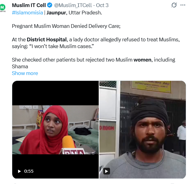 जौनपुर- नाम शमा परवीन और उनके पति अरमान, गांव पीली, थाना चंदव के रहनेवाले हैं. ३० सितंबर की इस घटना का वीडियो वीडियो सोशल मीडिया पर तेजी से वायरल हो गया, जिसके बाद ३ अक्टूबर को मीडिया और स्वास्थ्य विभाग में हलचल मच गई। जौनपुर के चंदव क्षेत्र की रहने वाली २७ वर्षीय शमा परवीन को ३० सितंबर की रात करीब ९. ३० बजे प्रसव पीड़ा शुरू हो गई। परिजनों ने तुरंत उसे जिला महिला अस्पताल पहुंचाया, जहां उसे सुबह ९ बजे के आसपास भर्ती किया गया था। लेकिन अस्पताल पहुंचने के बाद ड्यूटी पर मौजूद डॉक्टर ने उनका चेकअप करने से साफ मना कर दिया। शमा परवीन ने अपने वायरल वीडियो में आरोप लगाया कि वह खाट पर लेट गई, लेकिन डॉक्टर ने उन्हें देखने से इनकार कर दिया। यहां तक कि उन्होंने दूसरों को भी कहा कि मुझे ऑपरेशन थिएटर (OT) में न भेजा जाए। उन्होंने साफ कहा कि वह मुस्लिम महिला की डिलीवरी नहीं करवाऊंगी।