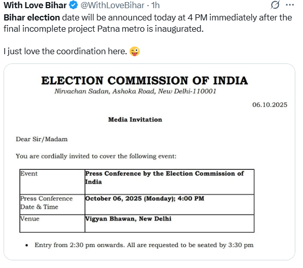 चुनाव आयोग आज बिहार विधानसभा चुनाव कार्यक्रम की घोषणा करेगा। २४३ सदस्यीय विधानसभा का कार्यकाल २२ नवंबर को समाप्त हो रहा है। राजनीतिक दलों ने छठ पर्व के बाद चुनाव कराने का आग्रह किया है ताकि मतदाताओं की अधिक भागीदारी हो सके। पिछला विधानसभा चुनाव कोविड-१९ महामारी के दौरान तीन चरणों में हुआ था।
