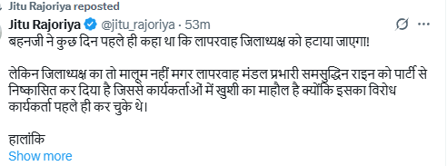 बसपा के प्रदेश अध्यक्ष विश्वनाथ पाल की तरफ से गुरुवार को जारी किए गए पत्र में जिक्र किया गया है कि झांसी के रहने वाले बीएसपी के लखनऊ और कानपुर मंडल के मंडल प्रभारी शमसुद्दीन राय लगातार अनुशासनहीनता कर रहे थे और पार्टी के अंदर गुटबाजी भी कर रहे थे. कई शिकायतें पार्टी कार्यकर्ताओं की तरफ से मिली थीं. इसके बाद जांच कराई गई तो शिकायत सही पाई गई. इसके बाद गुरुवार को उन्हें पार्टी से निष्कासित करने का फैसला लिया गया है. विश्वनाथ पाल ने ईटीवी भारत को बताया कि शमसुद्दीन राईन को इस मामले में कई बार चेतावनी भी दी जा चुकी थी, लेकिन उनकी गतिविधियों और कार्यशैली में कोई सुधार नहीं हुआ. पार्टी और मूवमेंट हित में बीएसपी की राष्ट्रीय अध्यक्ष मायावती के संज्ञान में लाकर उनको पार्टी से निष्कासित करने का निर्णय लिया गया है.