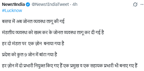 लखनऊ. उत्तर प्रदेश में २०२७ विधानसभा चुनाव से पहले बहुजन समाज पार्टी में सियासी हलचल तेज हो गई है. पार्टी सुप्रीमो मायावती ने संगठन को मजबूत करने के लिए बड़ा बदलाव किया है. मंडलीय व्यवस्था को पूरी तरह खत्म कर अब जोनल सिस्टम लागू कर दिया गया है. इसी कड़ी में गाजियाबाद जिले के नए अध्यक्ष के रूप में मनोज जाटव को जिम्मेदारी सौंपी गई है, जबकि आनंद चंद्रेश को मेरठ मंडल का प्रभारी बनाया गया. बसपा हाईकमान ने शुक्रवार को नया आदेश जारी कर इसकी आधिकारिक घोषणा की. यह कदम २०२७ के विधानसभा चुनावों से पहले पार्टी को नई ऊर्जा देने की कोशिश के तौर पर देखा जा रहा है. पार्टी के वरिष्ठ नेताओं का कहना है कि यह फेरबदल गुटबाजी को रोकने और ग्रासरूट स्तर पर कार्यकर्ताओं को एकजुट करने का प्रयास है. मायावती ने हाल ही में कांशीराम की पुण्यतिथि पर रैली में कहा था कि बसपा अकेले चुनाव लड़ेगी . अब जोनल सिस्टम से राज्य को छह जोनों में बांटा गया है, जहां प्रत्येक जोन में दो मुख्य प्रभारी और तीन-चार सहायक नेता होंगे. यह व्यवस्था मंडलीय स्तर पर काम को सीधे मायावती तक पहुंचाएगी.