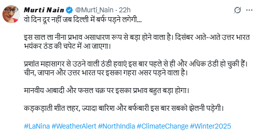 जवाब: भूमध्य रेखा के आस-पास प्रशांत महासागर की सतह अक्टूबर के शुरूआती हफ्ते में ही काफी ठंडी होने लगी है। ये शुरुआत है ला-नीना की और इशारा कि इस बार सर्दियां बेहद सर्द रह सकती हैं। भारत में मानसून भी इस साल जल्दी आया और औसत से 8% ज्यादा बारिश हुई। इसके चलते गर्मियां बहुत गर्म नहीं थी और समय से पहले ही सर्दियों की दस्तक शुरू होने लगी है। मौसम वैज्ञानिकों के मुताबिक उत्तर भारत में तापमान में भारी गिरावट की संभावना है। इसका मतलब है कि दिल्ली, पंजाब, हरियाणा, राजस्थान और उत्तर प्रदेश जैसे राज्यों में शीत लहर (कोल्ड वेव) के ज्यादा दिन देखने को मिल सकते हैं। तापमान सामान्य से काफी नीचे जा सकता है, जिससे ठंड और कोहरे का असर और गहराएगा। हिमाचल प्रदेश, उत्तराखंड और जम्मू और कश्मीर जैसे पहाड़ी राज्यों में इस बार बर्फबारी जल्दी शुरू हो सकती है और देर तक जारी रह सकती है। इससे पर्यटन पर भी असर पड़ेगा। जहां एक तरफ बर्फीले नजारों के लिए पर्यटकों की भीड़ बढ़ेगी, वहीं दूसरी ओर स्थानीय प्रशासन को सड़क बंद होने और ठंड से निपटने की अतिरिक्त तैयारी करनी होगी।