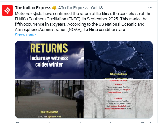 जवाब: नेशनल ओशनिक एंड एटमोस्फेरिक एडमिनिस्ट्रेशन यानी NOAA ने कहा है कि अक्टूबर से दिसंबर के बीच ला नीना के बनने की 71% संभावना है, जबकि दिसंबर से फरवरी के बीच यह संभावना 54% रहेगी। ला नीना पूरी दुनिया के मौसम और जलवायु पर असर डालता है। एक्सपर्ट्स का अनुमान है कि ये भूमध्य सागर से उठने वाले बर्फीले तूफान यानी वेस्टर्न डिस्टर्बेंस को और मजबूत बनाएगा। इससे उत्तर भारत के पहाड़ी इलाकों में बहुत ज्यादा बर्फ बारी होगी और मैदानी इलाकों में ठंडी हवाएं चलेंगी, कोहरा और धुंध बनी रहेगी। अनुमान लगाया जा रहा है कि भारत में ला नीना का सबसे ज्यादा असर जनवरी 2026 में दिखेगा। ये मार्च तक बना रहेगा और 2026 का बसंत काफी देर से आएगा। हालांकि कुछ मौसम विज्ञानियों का यह भी कहना है कि अगर इस साल ला-नीना बना भी, तो कमजोर होगा। इस बार की सर्दियों पर इसका बहुत ज्यादा असर नहीं पड़ेगा।