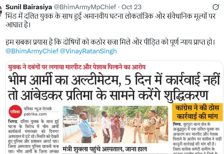 ज्ञात हो कि भिंड जिले के सुरपुरा थाना क्षेत्र के अजुद्दीपुरा गांव में विगत सोमवार दोपहर इंसानियत को शर्मसार करने वाली घटना सामने आई । यहां अनुसूचित समाज के ३३ वर्षीय युवक ज्ञान सिंह जाटव पुत्र विजय जाटव को कुछ दबंगों ने घर से किडनैप कर न केवल बेरहमी से पीटा बल्कि उसे जबरन पेशाब पिलाने जैसी अमानवीय हरकत भी की। पीड़ित के अनुसार, सोमवार दोपहर करीब ३ बजे वह अपने घर के बाहर बैठा था। तभी सोनू बरुआ निवासी सुरपुरा, आलोक पाठक और छोटू ओझा बोलेरो गाड़ी से आए।तीनों ने मिलकर उसे जबरदस्ती गाड़ी में डाल लिया और सेमरपुरा मोड़ तक ले गए। वहां पहुंचकर आरोपितों ने उसके साथ लात-घूंसों और डंडों से मारपीट की तथा उसे जबरन पेशाब पिलाई।