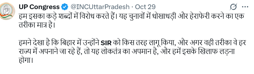 यूपी में एसआईआर शुरू होते ही कांग्रेस ने की ये मांग