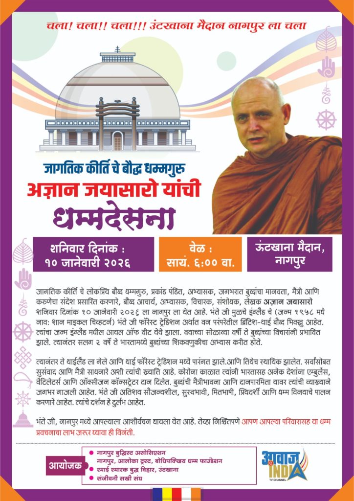 जगविख्यात भंते अजाहन जयासारों द्वारा धम्मदेसना का कार्यक्रम शनिवार १० जनवरी को नागपुर के ऊंटखाना मैदान में शाम ६ बजे आयोजित किया गया है. भंते अजाहन जयासारों जो एक प्रसिद्ध बौद्ध भिक्षु और शिक्षक हैं, वे अपने प्रवचनों और शिक्षाओं के लिए जाने जाते हैं, मध्यम मार्ग और जीवन के विभिन्न पहलुओं, जैसे कार्य, परिवार और आध्यात्मिक उन्नति पर मुख्या रूप से मार्गदर्शन करते हैं.