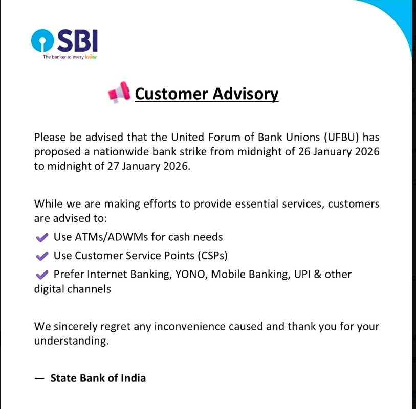 एसबीआई ने अपने आधिकारिक X हैंडल पर शुक्रवार रात एक पोस्ट जारी कर स्थिति स्पष्ट की है। बैंक ने अपने नोटिस में कहा है: “हमें बैंक यूनियनों द्वारा 26 जनवरी की आधी रात बाद से 27 जनवरी तक हड़ताल के आह्वान के बारे में सूचित किया गया है। हालांकि बैंक ने अपनी शाखाओं और कार्यालयों में सामान्य कामकाज सुनिश्चित करने के लिए आवश्यक व्यवस्थाएं की हैं, लेकिन हड़ताल के कारण शाखाओं में कामकाज प्रभावित होने की आशंका है।”