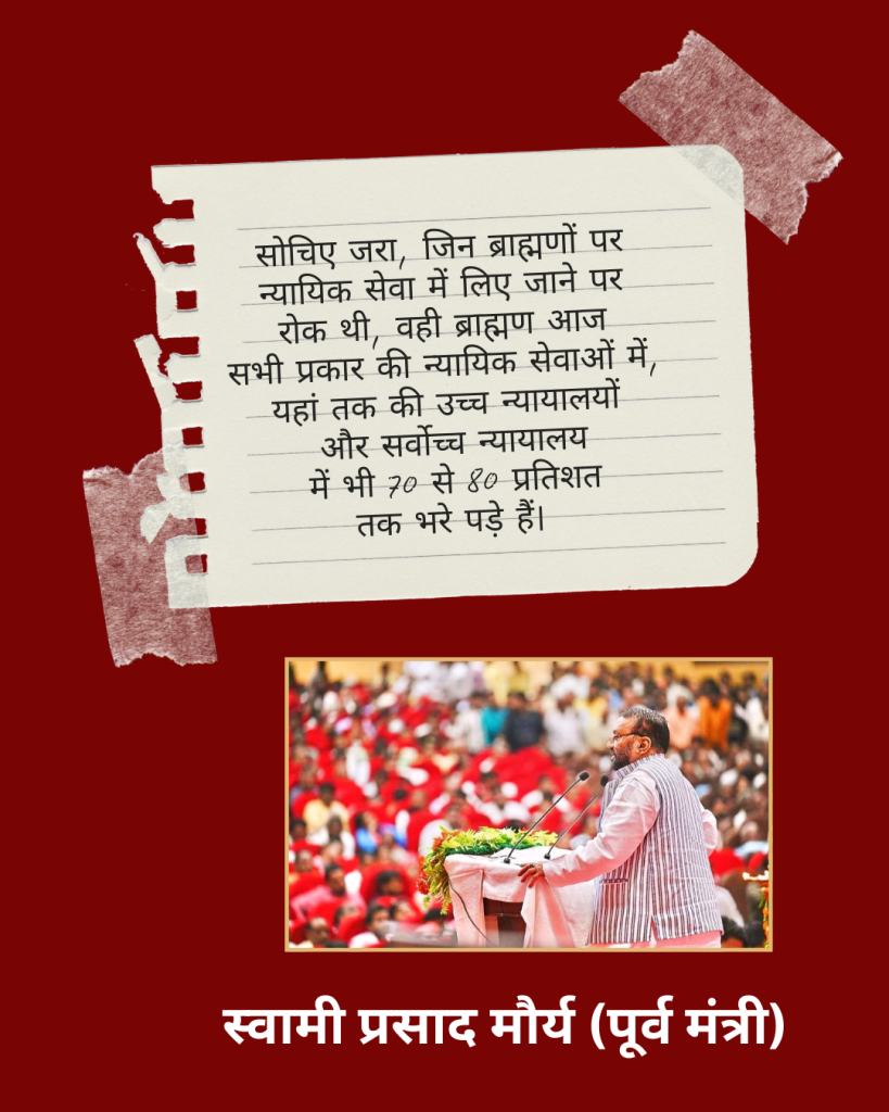 स्वामी प्रसाद मौर्य ने आगे लिखा कि सोचिए जरा, जिन ब्राह्मणों पर न्यायिक सेवा में लिए जाने पर रोक थी, वही ब्राह्मण आज सभी प्रकार की न्यायिक सेवाओं में, यहां तक की उच्च न्यायालयों और सर्वोच्च न्यायालय में भी 70 से 80 प्रतिशत तक भरे पड़े हैं।